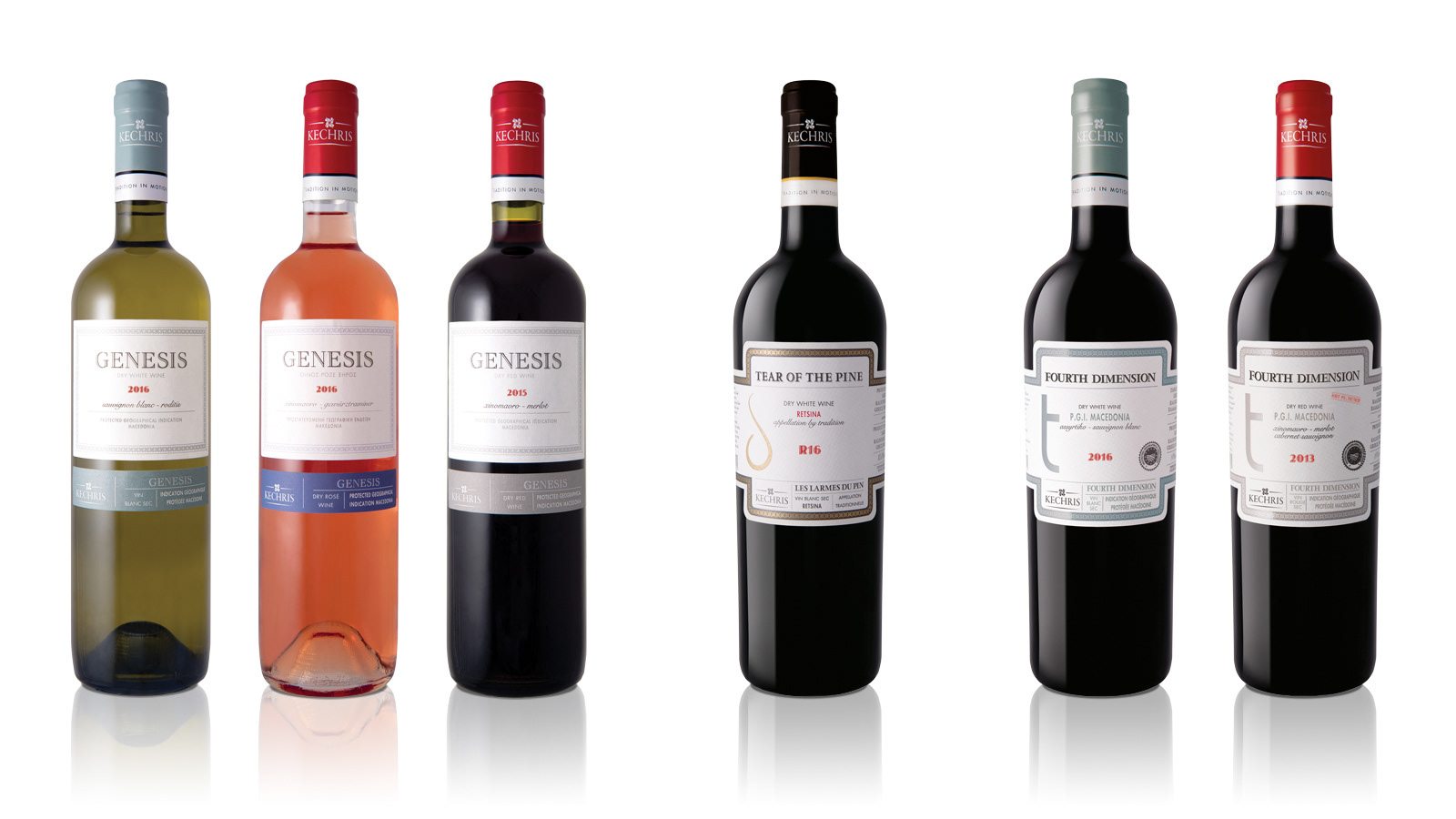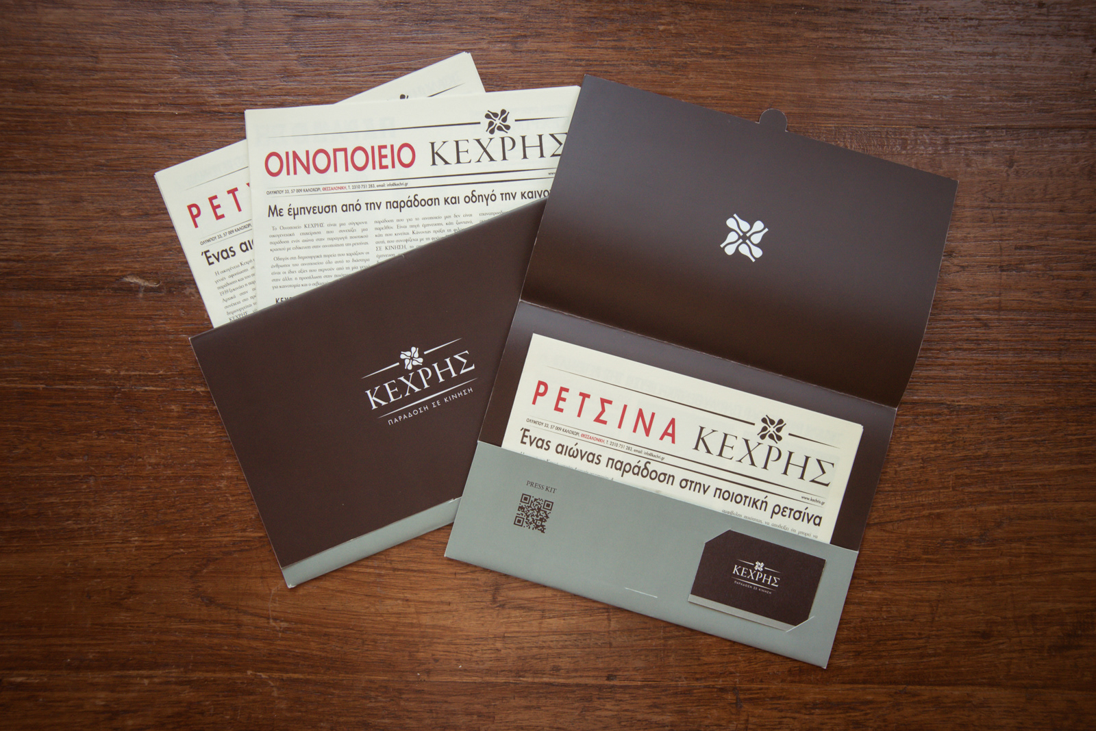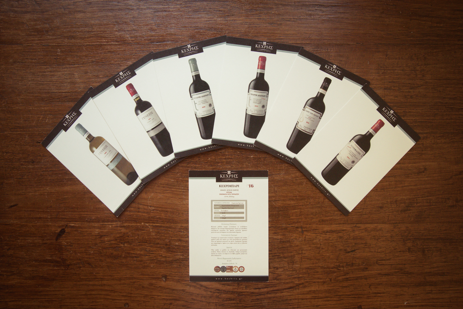 After many years of building the image of Kechris winery which had gained visibility and recognition we decided to change the look of the brand to reflect its long history, its quality, authenticity and innovation. Its name is the name of a visionary, a wine maker well known for his authenticity, his quality products and especially the fact that he and his family achieved to get retsina wine among top wines worldwide, to make it gain the place it always deserved to have in peoples minds. Thus, we could not have written the name with anything less than a timeless, classic and “classy” font such as Garamond. And could not think of a better symbol than that of the famous bottle shape of its well known retsina wine “Kechribari”. Placing the bottle in a way to create movement in order to transmit the “tradition in motion” tagline. All brand elements, classic and modern, serious and freehand typeface combinations, vintage colors, imagery and materials, get together in all design elements to create a vintage-classy look and reflect the winery’s values, its multidimensional character, its uniqueness.