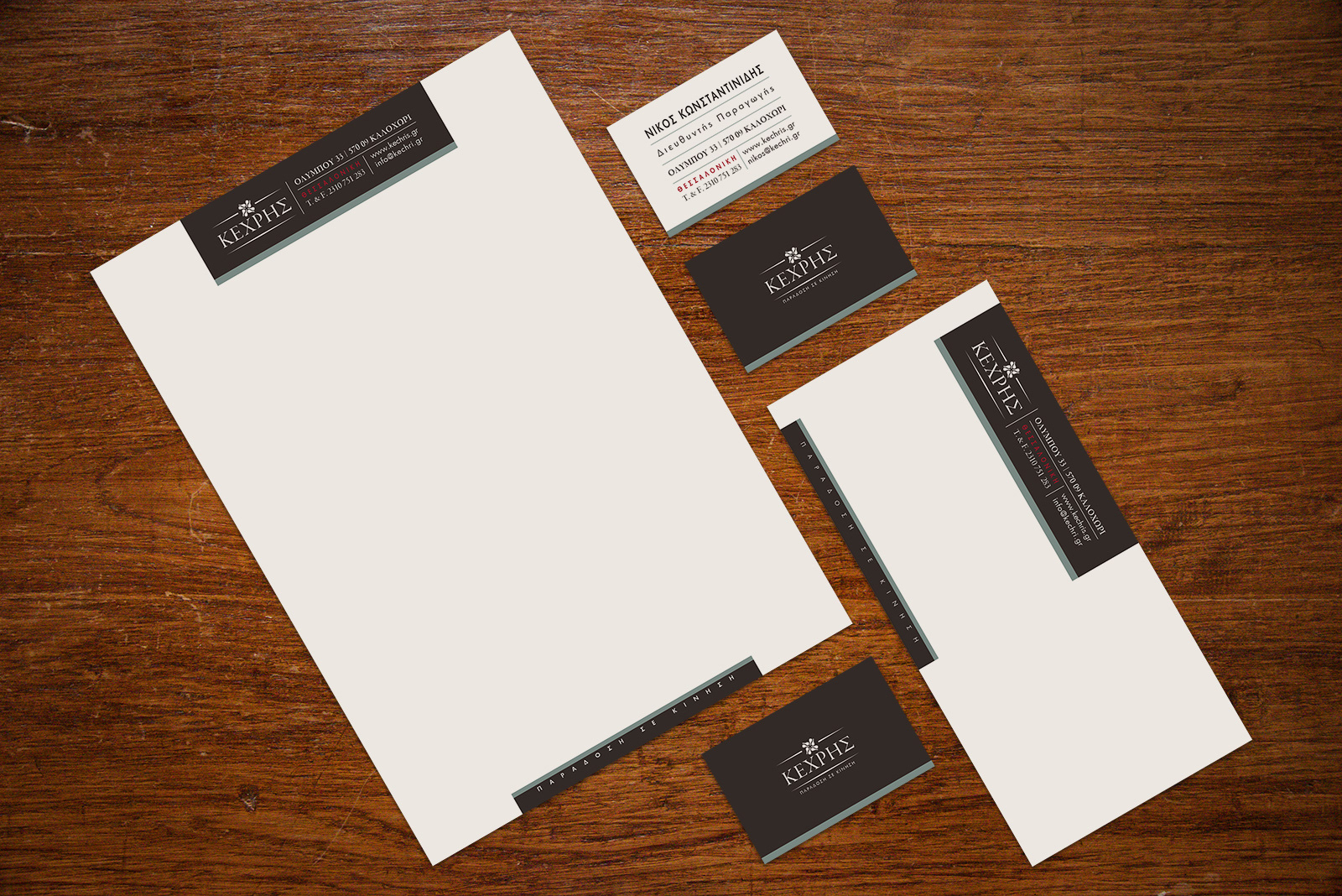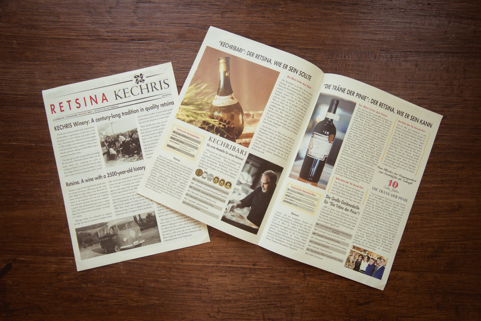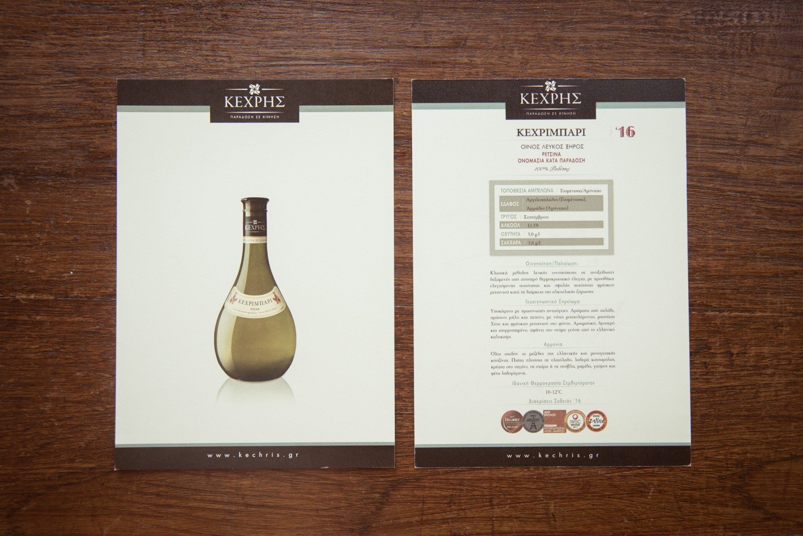 After many years of building the image of Kechris winery which had gained visibility and recognition we decided to change the look of the brand to reflect its long history, its quality, authenticity and innovation. Its name is the name of a visionary, a wine maker well known for his authenticity, his quality products and especially the fact that he and his family achieved to get retsina wine among top wines worldwide, to make it gain the place it always deserved to have in peoples minds. Thus, we could not have written the name with anything less than a timeless, classic and “classy” font such as Garamond. And could not think of a better symbol than that of the famous bottle shape of its well known retsina wine “Kechribari”. Placing the bottle in a way to create movement in order to transmit the “tradition in motion” tagline. All brand elements, classic and modern, serious and freehand typeface combinations, vintage colors, imagery and materials, get together in all design elements to create a vintage-classy look and reflect the winery’s values, its multidimensional character, its uniqueness.